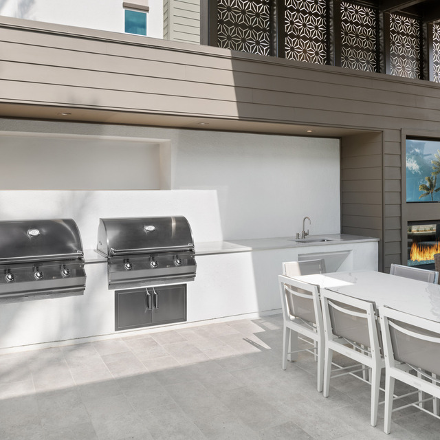 - Covered, outdoor lounge with fireplace and entertainment kitchen including gas BBQs and sink